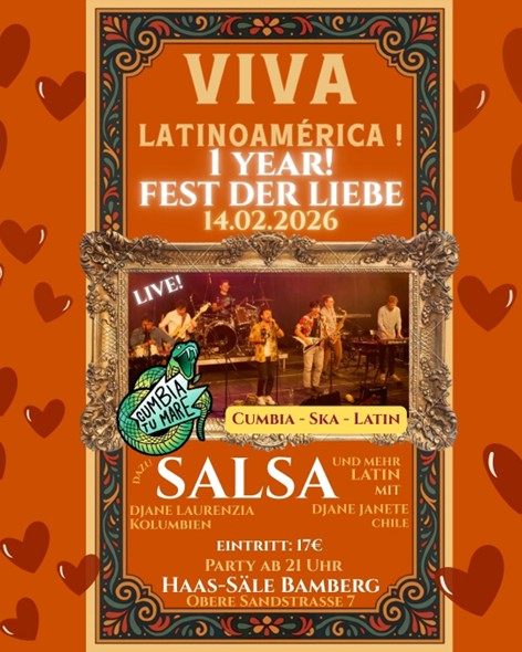 Zum ersten Jubiläum – und um die Liebe in all seinen Formen gebührend zu feiern – ziehen wir in die Haas-Säle Bamberg und haben dabei was ganz besonderes für euch: Live die Cumbia Band CUMBIA TU MARE! mit Cumbia, Ska und Latin.